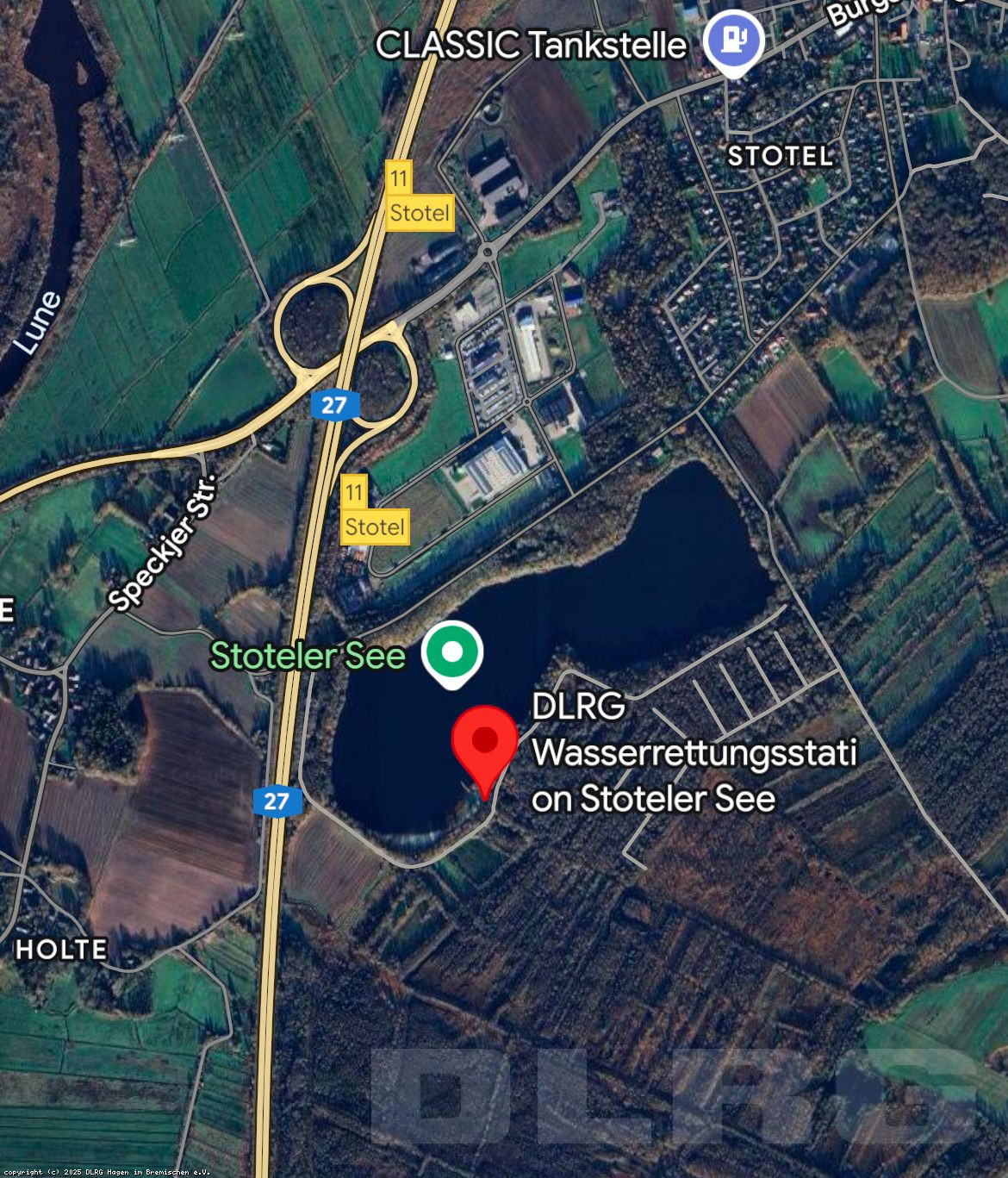 Der Stoteler See liegt direkt an der A27 an der Ausfahrt Stotel. Seit vielen Jahren gehört der Wasserrettungsdienst dort zu unseren Pflichtaufgaben im Sommer. Von Mitte Mai bis Ende August sind wir mit unserer Wachmannschaft an den Wochenenden und in den niedersächsischen Sommerferien täglich von 12 Uhr bis 18 Uhr vor Ort.